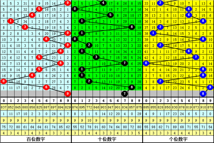 百位分析:最近7期百位分别开出奖号:8、5、8、5、4、0、6,百位振幅为8个点位,本期看好该位号码上升,注意号码9。